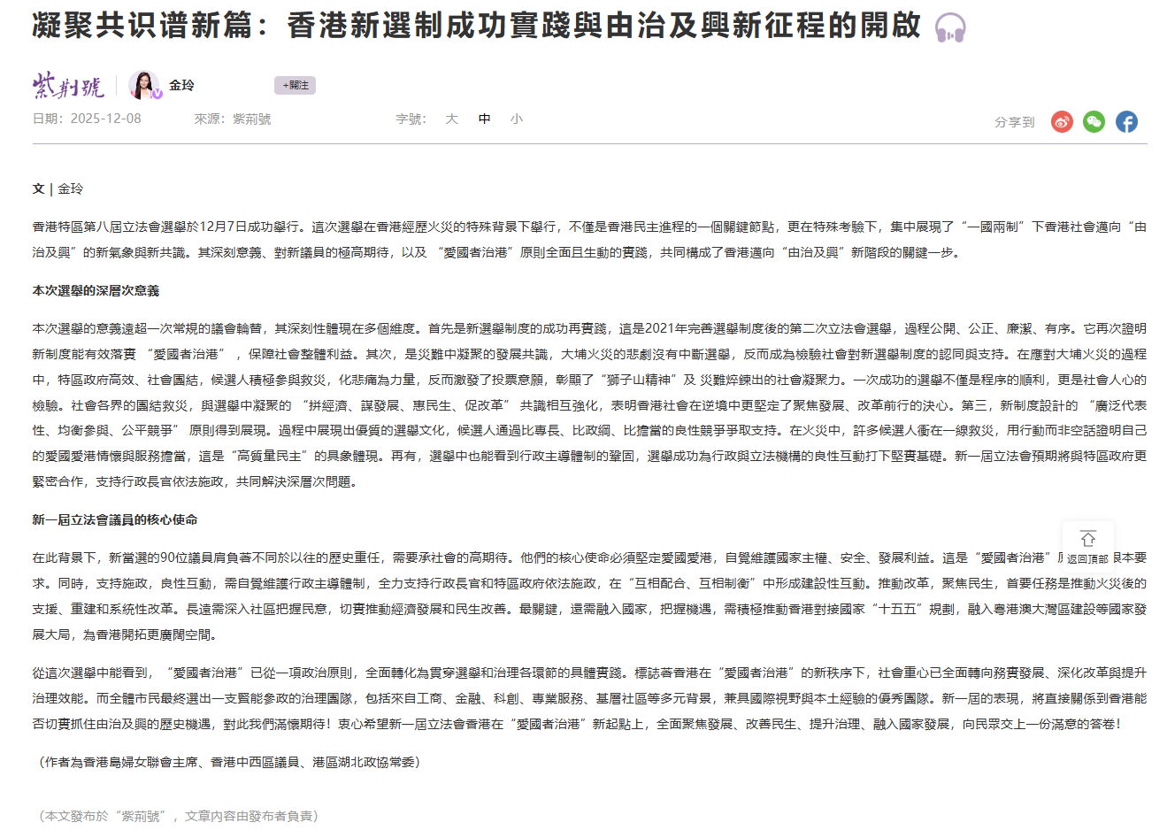 從這次選舉中能看到,“愛國者治港”已從一項政治原則,全面轉化為貫穿選舉和治理各環節的具體實踐。標誌著香港在“愛國者治港”的新秩序下,社會重心已全面轉向務實發展、深化改革與提升治理效能。而全體市民最終選出一支賢能參政的治理團隊,包括來自工商、金融、科創、專業服務、基層社區等多元背景,兼具國際視野與本土經驗的優秀團隊。新一屆的表現,將直接關係到香港能否切實抓住由治及興的歷史機遇,對此我們滿懷期待!衷心希望新一屆立法會香港在“愛國者治港”新起點上,全面聚焦發展、改善民生、提升治理、融入國家發展,向民眾交上一份滿意的答卷!