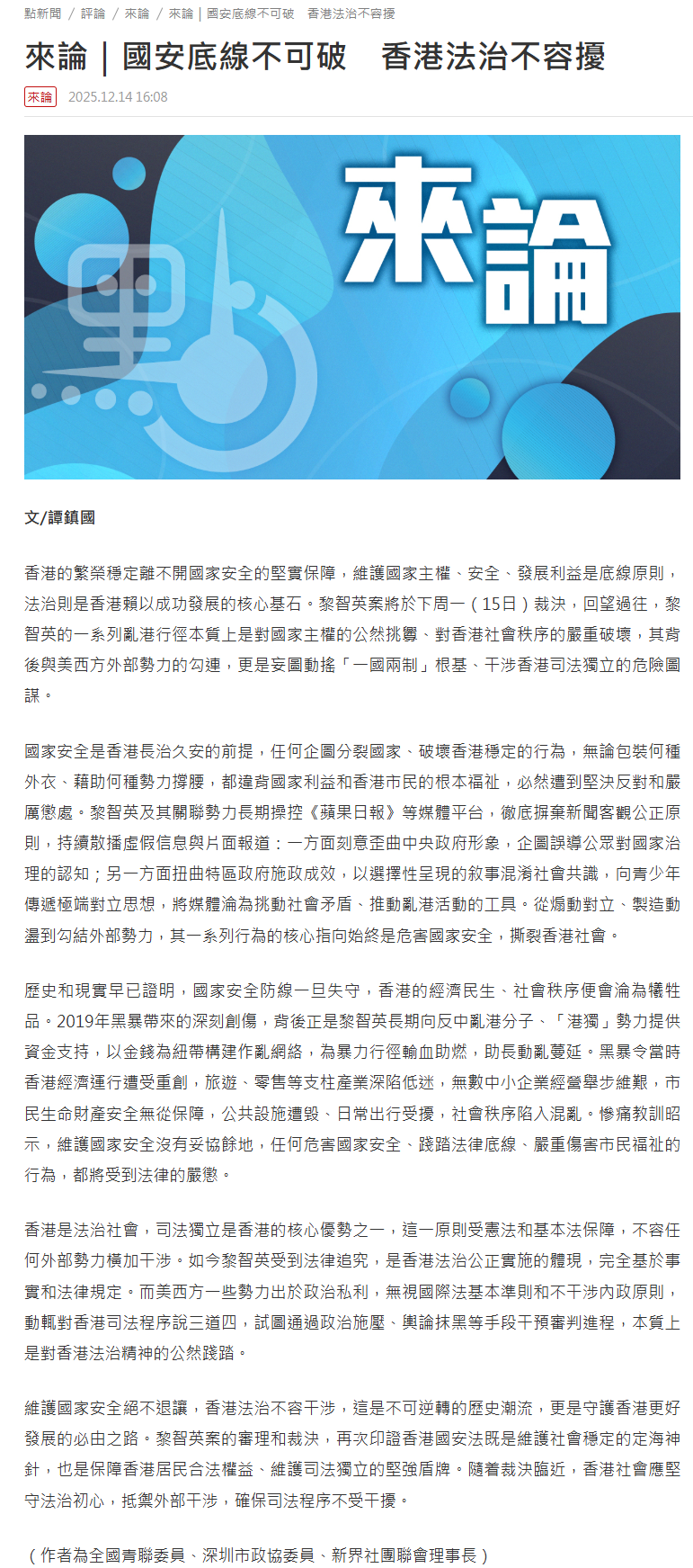 維護國家安全絕不退讓,香港法治不容干涉,這是不可逆轉的歷史潮流,更是守護香港更好發展的必由之路。黎智英案的審理和裁決,再次印證香港國安法既是維護社會穩定的定海神針,也是保障香港居民合法權益、維護司法獨立的堅強盾牌。隨着裁決臨近,香港社會應堅守法治初心,抵禦外部干涉,確保司法程序不受干擾。