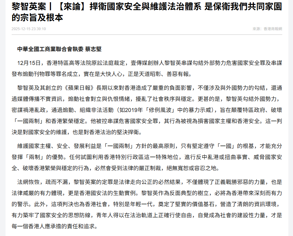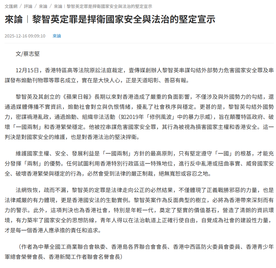 法網恢恢,疏而不漏,黎智英的定罪是法律走向公正的必然結果,不僅體現了正義戰勝邪惡的力量,也是法律威嚴的有力體現,更是香港國安法的生動實例。黎智英案作為反面典型的樹立,必將為香港帶來深刻而有力的警示。此外,這項判決也為香港社會,特別是年輕一代,奠定了堅實的價值基石,營造了清朗的資訊環境,有力築牢了國家安全的思想防線,青年人得以在法治軌道上正確行使自由,自覺成為社會的建設性力量,才是每一個香港人應承擔的責任和追求。