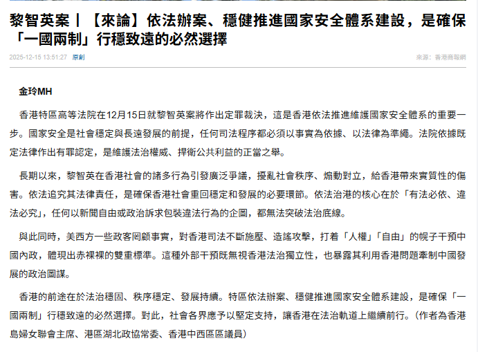 長期以來,黎智英在香港社會的諸多行為引發廣泛爭議,擾亂社會秩序、煽動對立,給香港帶來實質性的傷害。依法追究其法律責任,是確保香港社會重回穩定和發展的必要環節。依法治港的核心在於「有法必依、違法必究」,任何以新聞自由或政治訴求包裝違法行為的企圖,都無法突破法治底線。