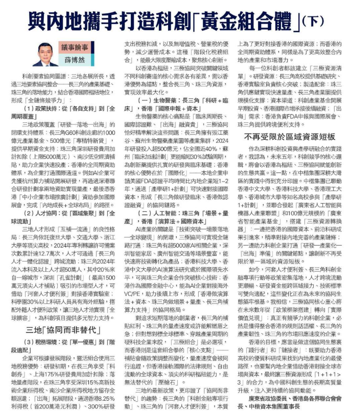 如今,河套人才便利簽、長三角科創金融專項行動等政策密集落地,人才跨境流動更順暢、研發資金能跨區域接力、技術標準可雙向適配,這些變化正在為未來的協同生態築牢根基。我相信,三極協同核心重心將在未來數年從「政策框架搭建」轉向「實際價值兌現」:真正有競爭力的科創企業,必然是懂得整合香港的規則話語權、長三角的產業韌性、珠三角的市場回應速度的企業。