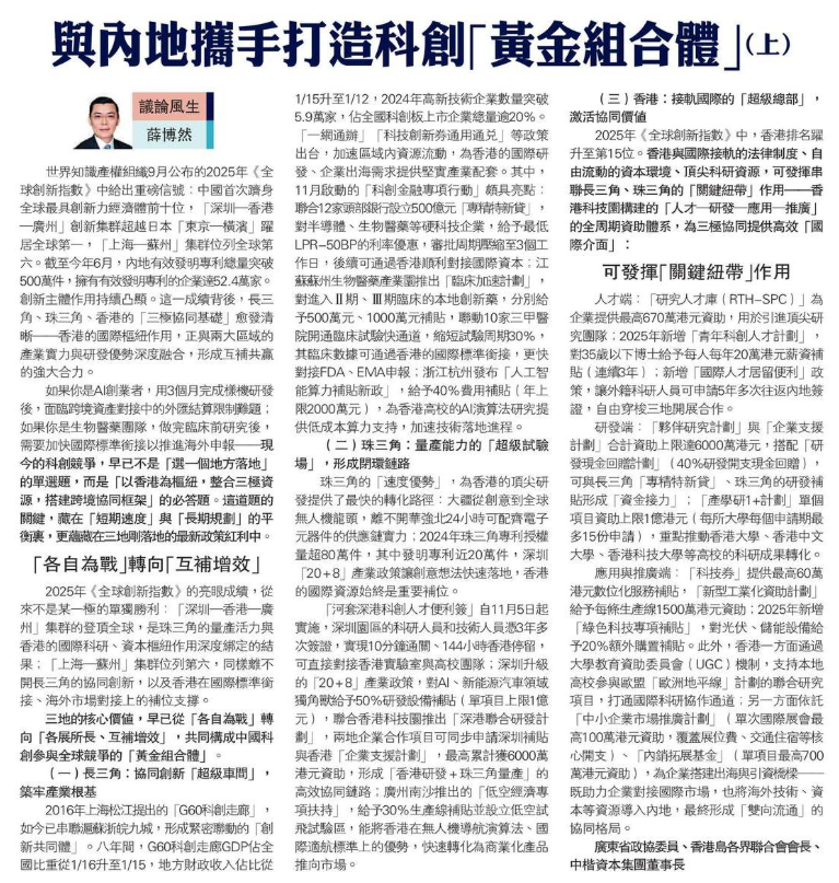2025年《全球創新指數》中,香港排名躍升至第15位。香港與國際接軌的法律制度、自由流動的資本環境、頂尖科研資源,可發揮串聯長三角、珠三角的「關鍵紐帶」作用——香港科技園構建的「人才─研發─應用─推廣」的全周期資助體系,為三極協同提供高效「國際介面」: