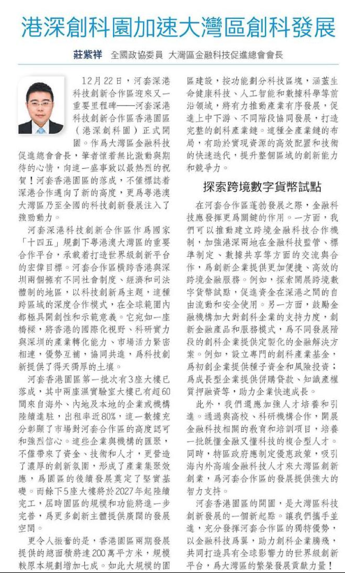 12月22日,河套深港科技創新合作區迎來又一重要里程碑——河套深港科技創新合作區香港園區(港深創科園)正式開園。作為大灣區金融科技促進總會會長,筆者懷着無比激動與期待的心情,向這一盛事致以最熱烈的祝賀!河套香港園區的落成,不僅標誌着深港合作邁向了新的高度,更為粵港澳大灣區乃至全國的科技創新發展注入了強勁動力。
