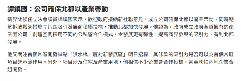 新界北候任立法會議員譚鎮國表示,歡迎政府接納新社聯意見,成立公司確保北都以產業帶動,同時期望拆牆鬆綁措施令片區吸引發展商積極投標,推動北都加快發展。他認為,政府成立政府全資擁有的產業園公司,創造空間採用不同的公私營合作模式,令發展更有彈性,提高商界參與的吸引力,有利北都發展。