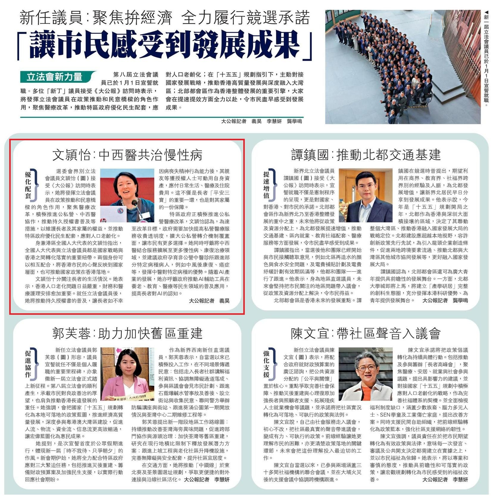 選委會界別立法會議員文頴怡(圖)接受《大公報》訪問時表示,她將發揮立法會議員在政策推動和民意橋樑的角色作用,聚焦醫療改革,積極推進公私營、中西醫協作,推動持久授權書普及等措施,以維護長者及其家屬的權益,並推動特區政府優化民生配套,應對人口老齡化。