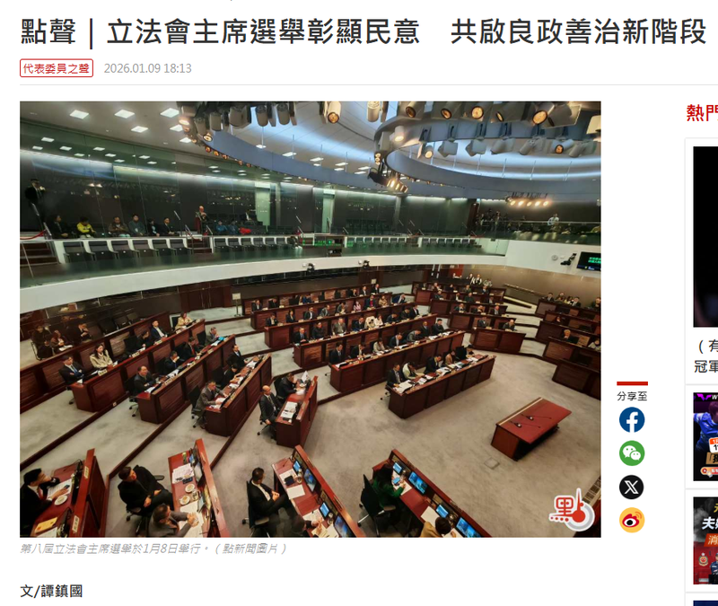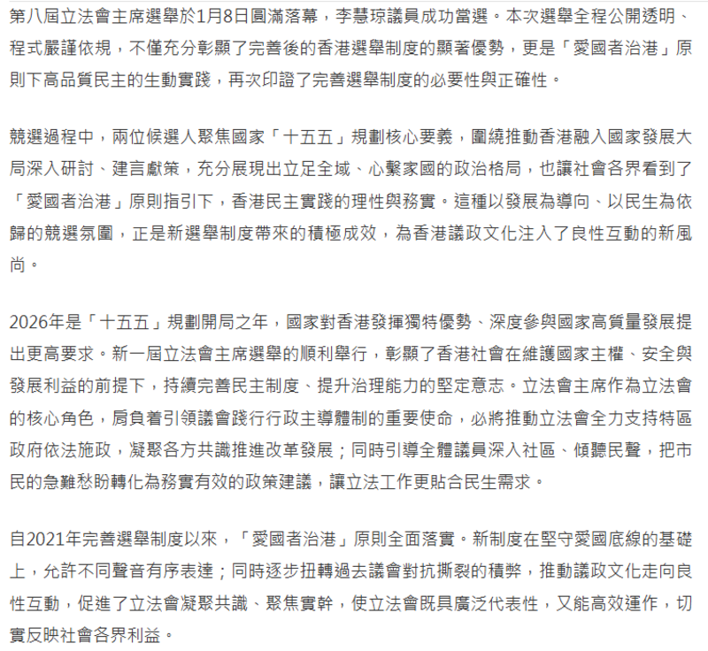 第八屆立法會主席選舉於1月8日圓滿落幕,李慧琼議員成功當選。本次選舉全程公開透明、程式嚴謹依規,不僅充分彰顯了完善後的香港選舉制度的顯著優勢,更是「愛國者治港」原則下高品質民主的生動實踐,再次印證了完善選舉制度的必要性與正確性。