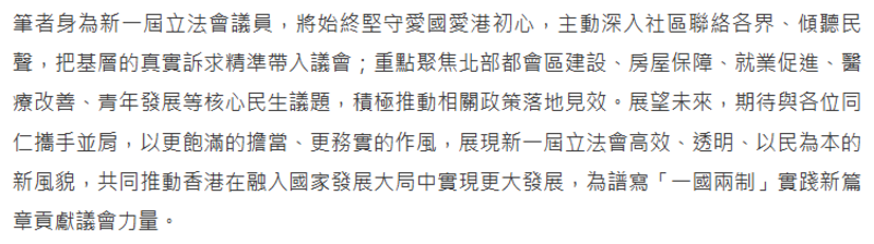筆者身為新一屆立法會議員,將始終堅守愛國愛港初心,主動深入社區聯絡各界、傾聽民聲,把基層的真實訴求精準帶入議會;重點聚焦北部都會區建設、房屋保障、就業促進、醫療改善、青年發展等核心民生議題,積極推動相關政策落地見效。展望未來,期待與各位同仁攜手並肩,以更飽滿的擔當、更務實的作風,展現新一屆立法會高效、透明、以民為本的新風貌,共同推動香港在融入國家發展大局中實現更大發展,為譜寫「一國兩制」實踐新篇章貢獻議會力量。