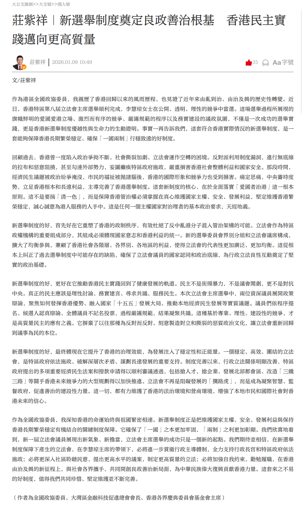 作為全國政協委員,我深知香港的命運始終與祖國緊密相連。新選舉制度正是把維護國家主權、安全、發展利益與保持香港長期繁榮穩定有機結合的關鍵制度保障。它確保了「一國」之本更加牢固,「兩制」之利更加彰顯。我們欣喜地看到,新一屆立法會議員展現出新氣象、新擔當,立法會主席選舉的成功只是一個新的起點。我們期待並相信,在新選舉制度保障下產生的立法會,在李慧琼主席的帶領下,必將進一步貫徹行政主導體制,全力支持行政長官和特區政府依法施政;必將更深入社區聆聽民意,提出更高水平的議案,制定更高質量的立法;必將加強自我約束,勤勉履職,在香港由治及興的新征程上,與社會各界攜手,共同開創良政善治新局面,為中華民族偉大復興貢獻香港力量。這套來之不易的好制度,值得我們共同珍惜、堅定維護並不斷完善。