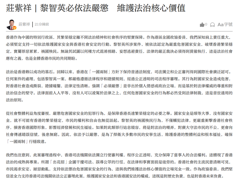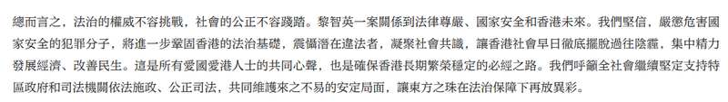 總而言之,法治的權威不容挑戰,社會的公正不容踐踏。黎智英一案關係到法律尊嚴、國家安全和香港未來。我們堅信,嚴懲危害國家安全的犯罪分子,將進一步鞏固香港的法治基礎,震懾潛在違法者,凝聚社會共識,讓香港社會早日徹底擺脫過往陰霾,集中精力發展經濟、改善民生。這是所有愛國愛港人士的共同心聲,也是確保香港長期繁榮穩定的必經之路。我們呼籲全社會繼續堅定支持特區政府和司法機關依法施政、公正司法,共同維護來之不易的安定局面,讓東方之珠在法治保障下再放異彩。