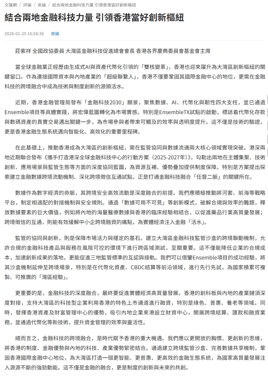更重要的是,金融科技的深度融合,最終要促進實體經濟高質量發展。香港的創科板與內地的產業鏈須深度對接,支持大灣區的科技型企業利用香港的特色上市通道進行融資,特別是綠色、普惠、養老等領域。同時,發揮香港資產及財富管理中心的優勢,吸引內地企業來港設立財資中心,開展跨境結算、匯款和融資業務,並通過代幣化等新技術,提升資金管理的效率與靈活性。