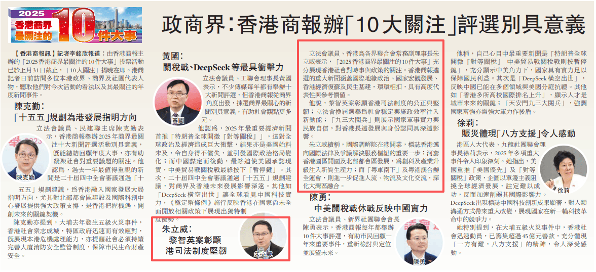 立法會議員、香港島各界聯合會常務副理事長朱立威表示, 「2025香港商界最關注的10件大事」充分展現香港社會對時事與政策的關注。香港商報遴選的重大新聞涵蓋國際地緣政治、國家宏觀發展、香港經濟復蘇及民生基建,環環相扣,具有高度代表性與參考價值。