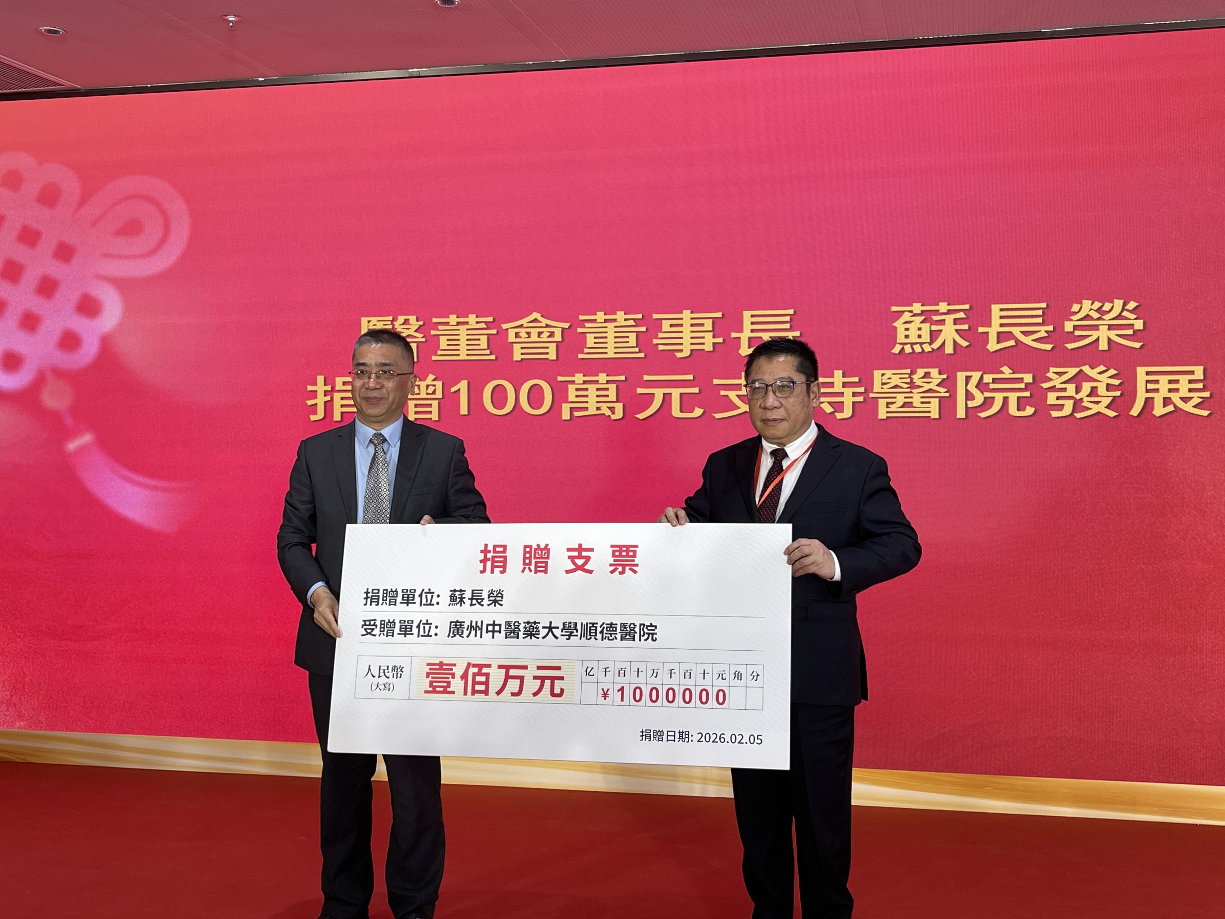 2026年2月5日,「德澤桑梓 共襄順醫—廣州中醫藥大學順德醫院董事會成立大會暨第一屆第一次會議」順利舉行。會上,本會理事長蘇長榮獲推選出任醫董會董事長,並以個人名義向廣州中醫藥大學順德醫院捐贈人民幣壹佰萬元,支持醫院建設與長遠發展。