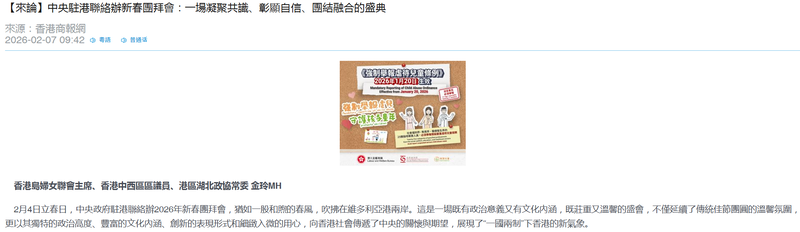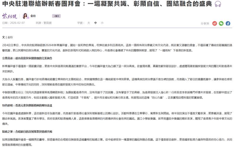 2月4日立春日,中央政府駐港聯絡辦2026年新春團拜會,猶如一股和煦的春風,吹拂在維多利亞港兩岸。這是一場既有政治意義又有文化內涵,既莊重又溫馨的盛會,不僅延續了傳統佳節團圓的溫馨氛圍,更以其獨特的政治高度、豐富的文化內涵、創新的表現形式和細緻入微的用心,向香港社會傳遞了中央的關懷與期望,展現了“一國兩制”下香港的新氣象。