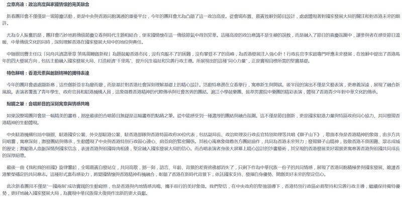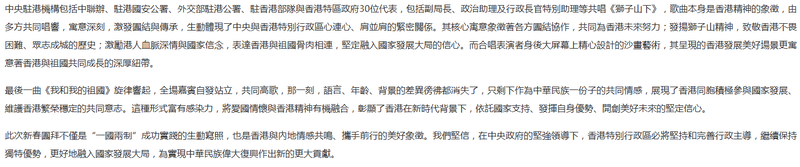 如果說整場團拜會是一幅精美的畫卷,那麼最後的合唱節目無疑是這幅畫卷的點睛之筆。從中能感受到一種濃厚的團結與融合氛圍。這不僅是節目創新,更是國家駐港力量與特區政府同心協力、共同發揚香港精神的生動體現。