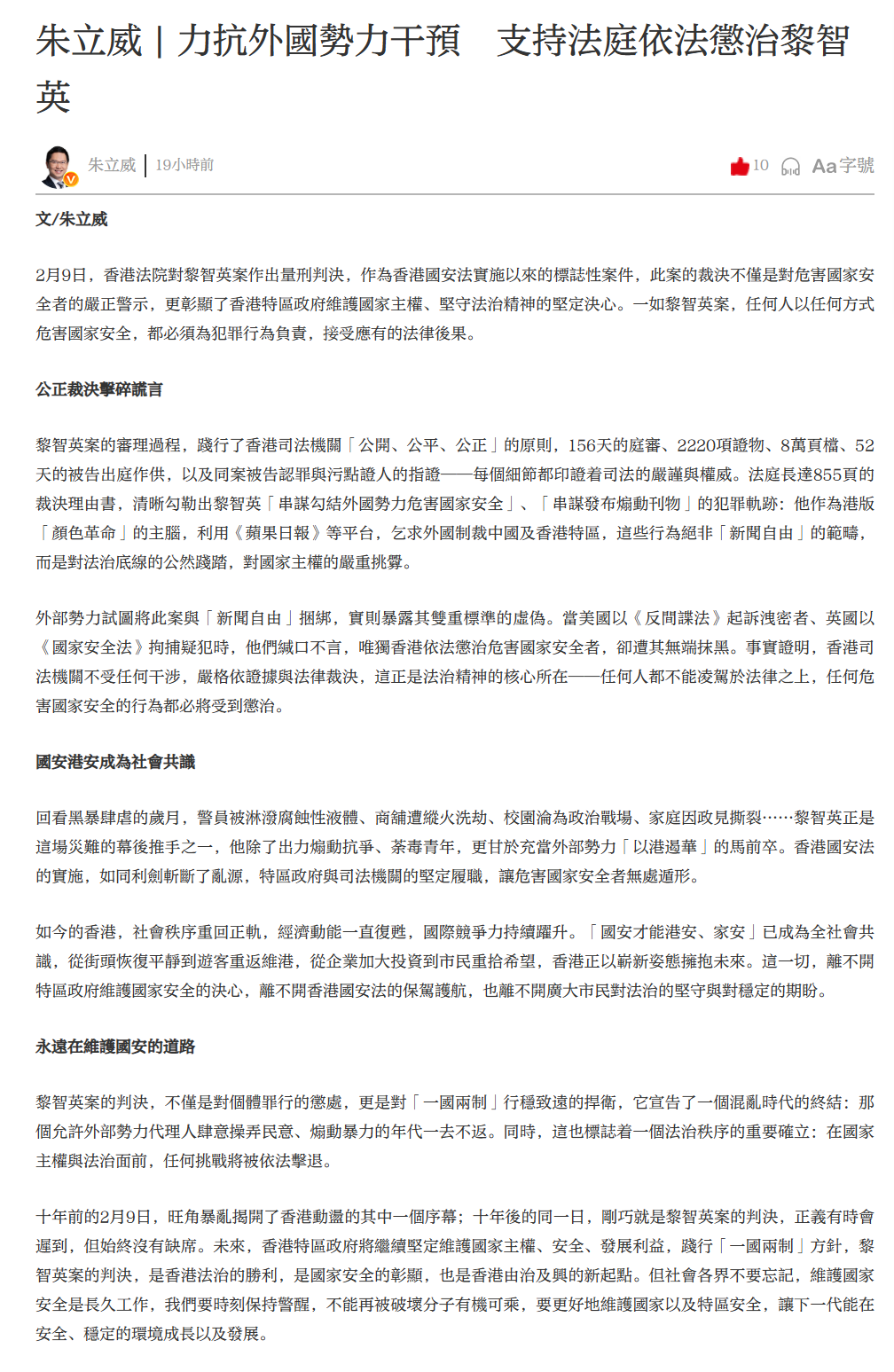十年前的2月9日,旺角暴亂揭開了香港動盪的其中一個序幕;十年後的同一日,剛巧就是黎智英案的判決,正義有時會遲到,但始終沒有缺席。未來,香港特區政府將繼續堅定維護國家主權、安全、發展利益,踐行「一國兩制」方針,黎智英案的判決,是香港法治的勝利,是國家安全的彰顯,也是香港由治及興的新起點。但社會各界不要忘記,維護國家安全是長久工作,我們要時刻保持警醒,不能再被破壞分子有機可乘,要更好地維護國家以及特區安全,讓下一代能在安全、穩定的環境成長以及發展。
