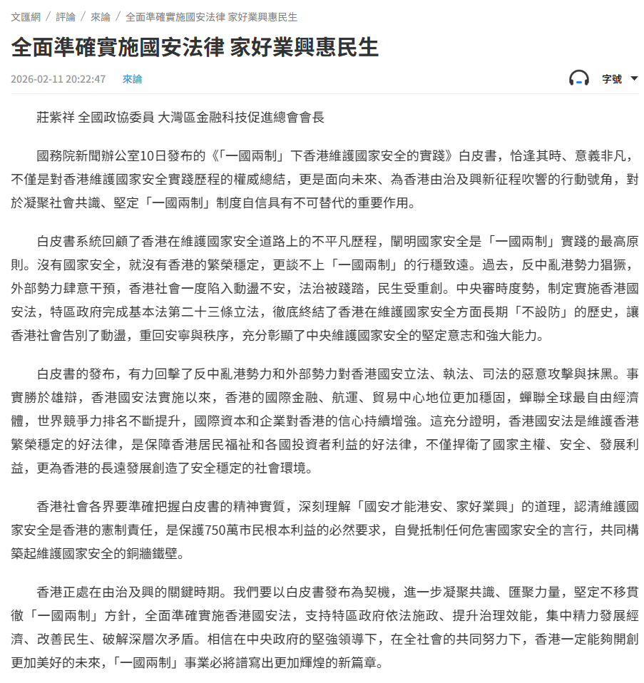 國務院新聞辦公室10日發布的《「一國兩制」下香港維護國家安全的實踐》白皮書,恰逢其時、意義非凡,不僅是對香港維護國家安全實踐歷程的權威總結,更是面向未來、為香港由治及興新征程吹響的行動號角,對於凝聚社會共識、堅定「一國兩制」制度自信具有不可替代的重要作用。