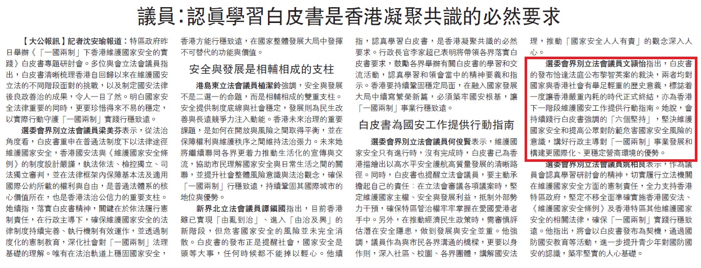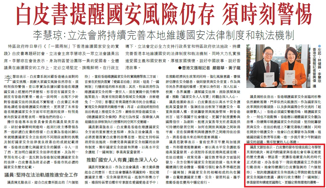 選委會界別立法會議員文頴怡指出,白皮書的發布恰逢法庭公布黎智英案的裁決,兩者均對國家與香港社會有舉足輕重的歷史意義,標誌着一度讓香港嚴重內耗的時代正式終結,亦為香港下一階段維護國安工作提供行動指南。她說,會持續踐行白皮書強調的「六個堅持」,堅決維護國家安全和提高公眾對防範危害國家安全風險的意識,講好行政主導對「一國兩制」事業發展和構建更國際化、更穩定營商環境的優勢。