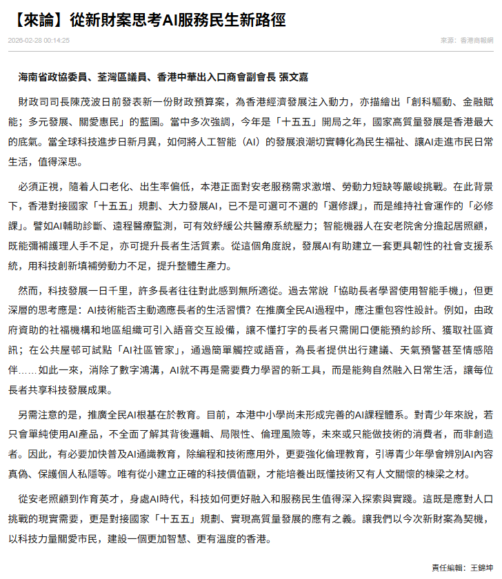 財政司司長陳茂波日前發表新一份財政預算案,為香港經濟發展注入動力,亦描繪出「創科驅動、金融賦能;多元發展、關愛惠民」的藍圖。當中多次強調,今年是「十五五」開局之年,國家高質量發展是香港最大的底氣。當全球科技進步日新月異,如何將人工智能(AI)的發展浪潮切實轉化為民生福祉、讓AI走進市民日常生活,值得深思。