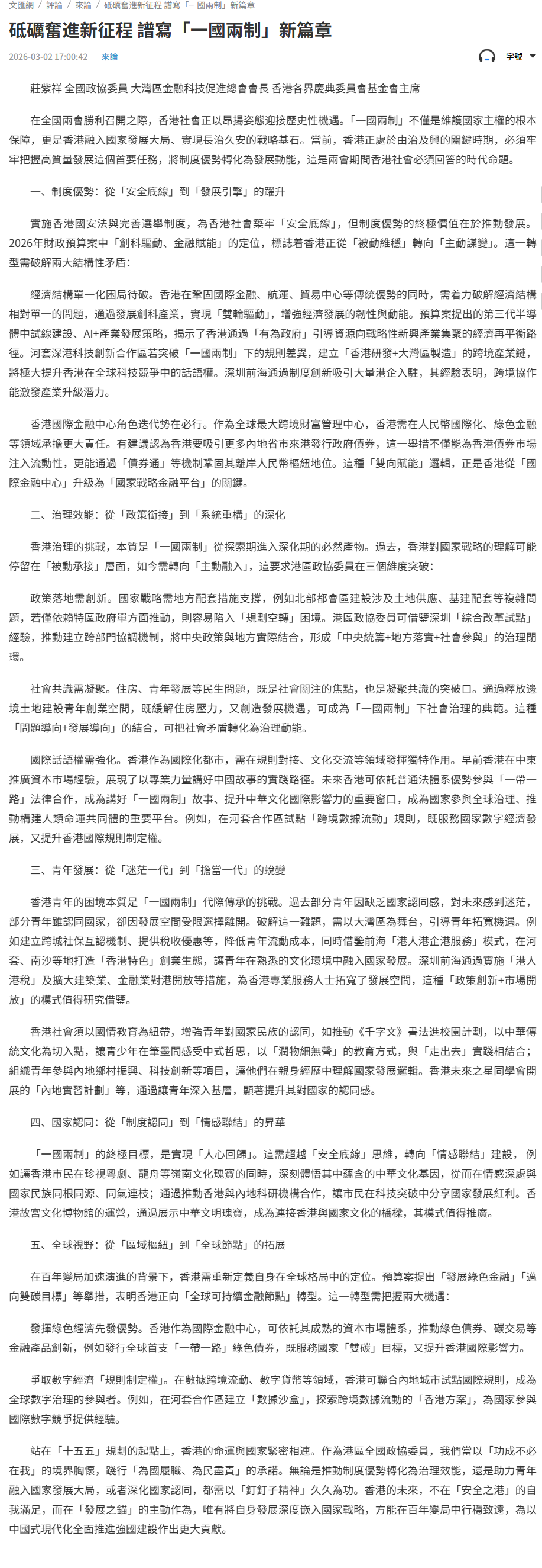 在全國兩會勝利召開之際,香港社會正以昂揚姿態迎接歷史性機遇。「一國兩制」不僅是維護國家主權的根本保障,更是香港融入國家發展大局、實現長治久安的戰略基石。當前,香港正處於由治及興的關鍵時期,必須牢牢把握高質量發展這個首要任務,將制度優勢轉化為發展動能,這是兩會期間香港社會必須回答的時代命題。