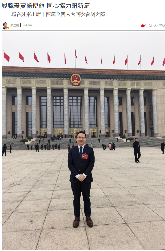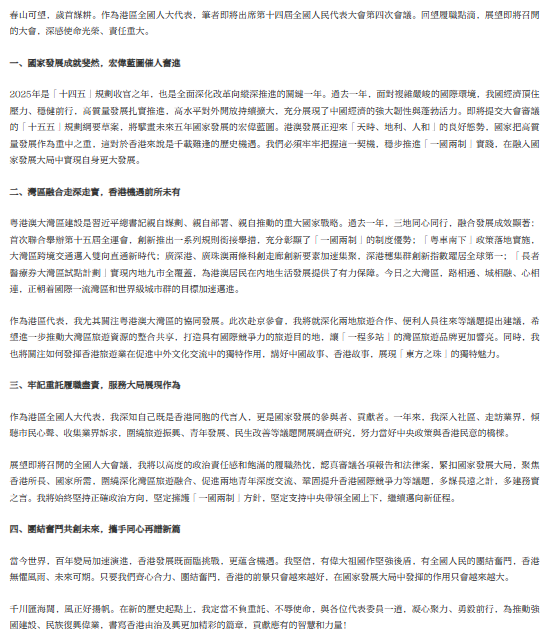 展望即將召開的全國人大會議,我將以高度的政治責任感和飽滿的履職熱忱,認真審議各項報告和法律案,緊扣國家發展大局,聚焦香港所長、國家所需,圍繞深化灣區旅遊融合、促進兩地青年深度交流、鞏固提升香港國際競爭力等議題,多謀長遠之計,多建務實之言。我將始終堅持正確政治方向,堅定擁護「一國兩制」方針,堅定支持中央帶領全國上下,繼續邁向新佂程。
