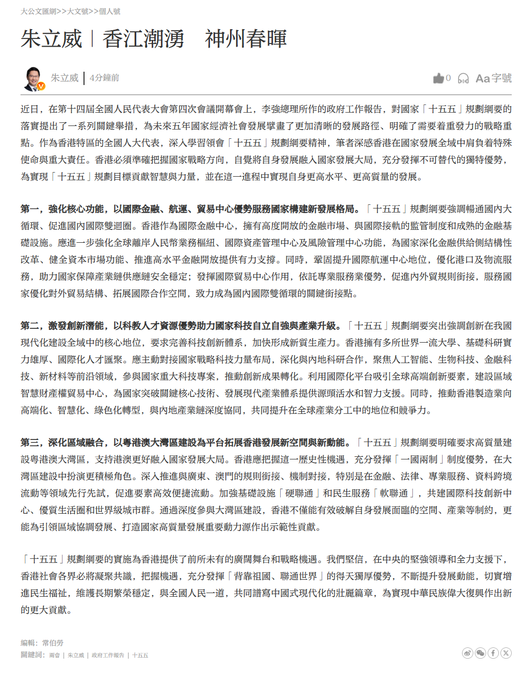 「十五五」規劃綱要的實施為香港提供了前所未有的廣闊舞台和戰略機遇。我們堅信,在中央的堅強領導和全力支援下,香港社會各界必將凝聚共識,把握機遇,充分發揮「背靠祖國、聯通世界」的得天獨厚優勢,不斷提升發展動能,切實增進民生福祉,維護長期繁榮穩定,與全國人民一道,共同譜寫中國式現代化的壯麗篇章,為實現中華民族偉大復興作出新的更大貢獻。