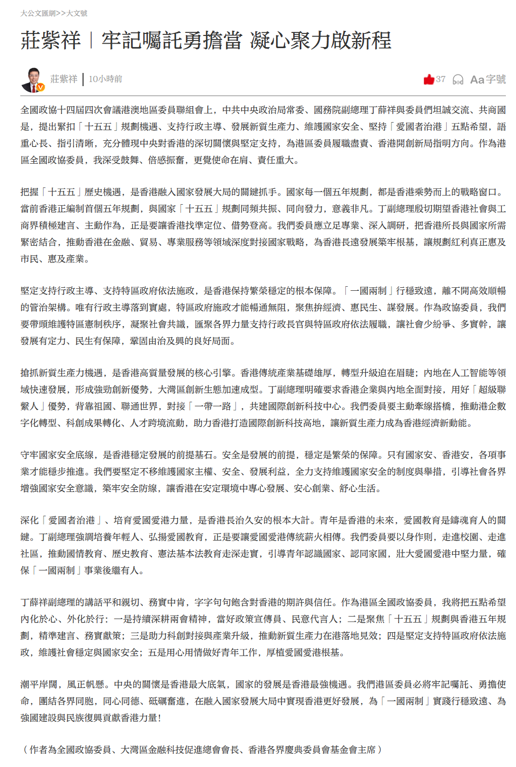 全國政協十四屆四次會議港澳地區委員聯組會上,中共中央政治局常委、國務院副總理丁薛祥與委員們坦誠交流、共商國是,提出緊扣「十五五」規劃機遇、支持行政主導、發展新質生產力、維護國家安全、堅持「愛國者治港」五點希望,語重心長、指引清晰,充分體現中央對香港的深切關懷與堅定支持,為港區委員履職盡責、香港開創新局指明方向。作為港區全國政協委員,我深受鼓舞、倍感振奮,更覺使命在肩、責任重大。