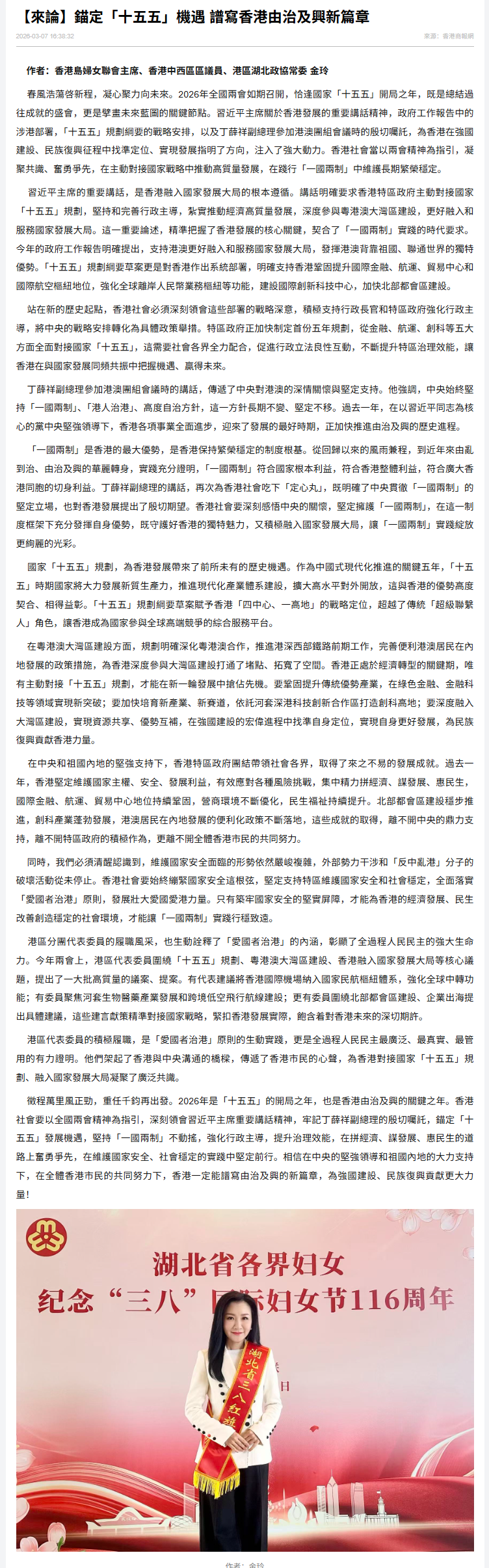 徵程萬里風正勁,重任千鈞再出發。2026年是「十五五」的開局之年,也是香港由治及興的關鍵之年。香港社會要以全國兩會精神為指引,深刻領會習近平主席重要講話精神,牢記丁薛祥副總理的殷切囑託,錨定「十五五」發展機遇,堅持「一國兩制」不動搖,強化行政主導,提升治理效能,在拼經濟、謀發展、惠民生的道路上奮勇爭先,在維護國家安全、社會穩定的實踐中堅定前行。相信在中央的堅強領導和祖國內地的大力支持下,在全體香港市民的共同努力下,香港一定能譜寫由治及興的新篇章,為強國建設、民族復興貢獻更大力量!