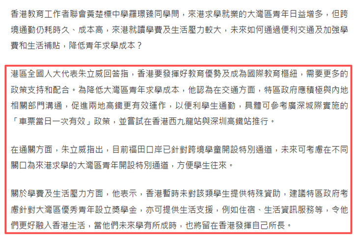 港區全國人大代表朱立威回答指,香港要發揮好教育優勢及成為國際教育樞紐,需要更多的政策支持和配合。為降低大灣區青年求學成本,他認為在交通方面,特區政府應積極與內地相關部門溝通,促進兩地高鐵更有效運作,以便利學生通勤,具體可參考廣深城際實施的「車票當日一次有效」政策,並嘗試在香港西九龍站與深圳高鐵站推行。