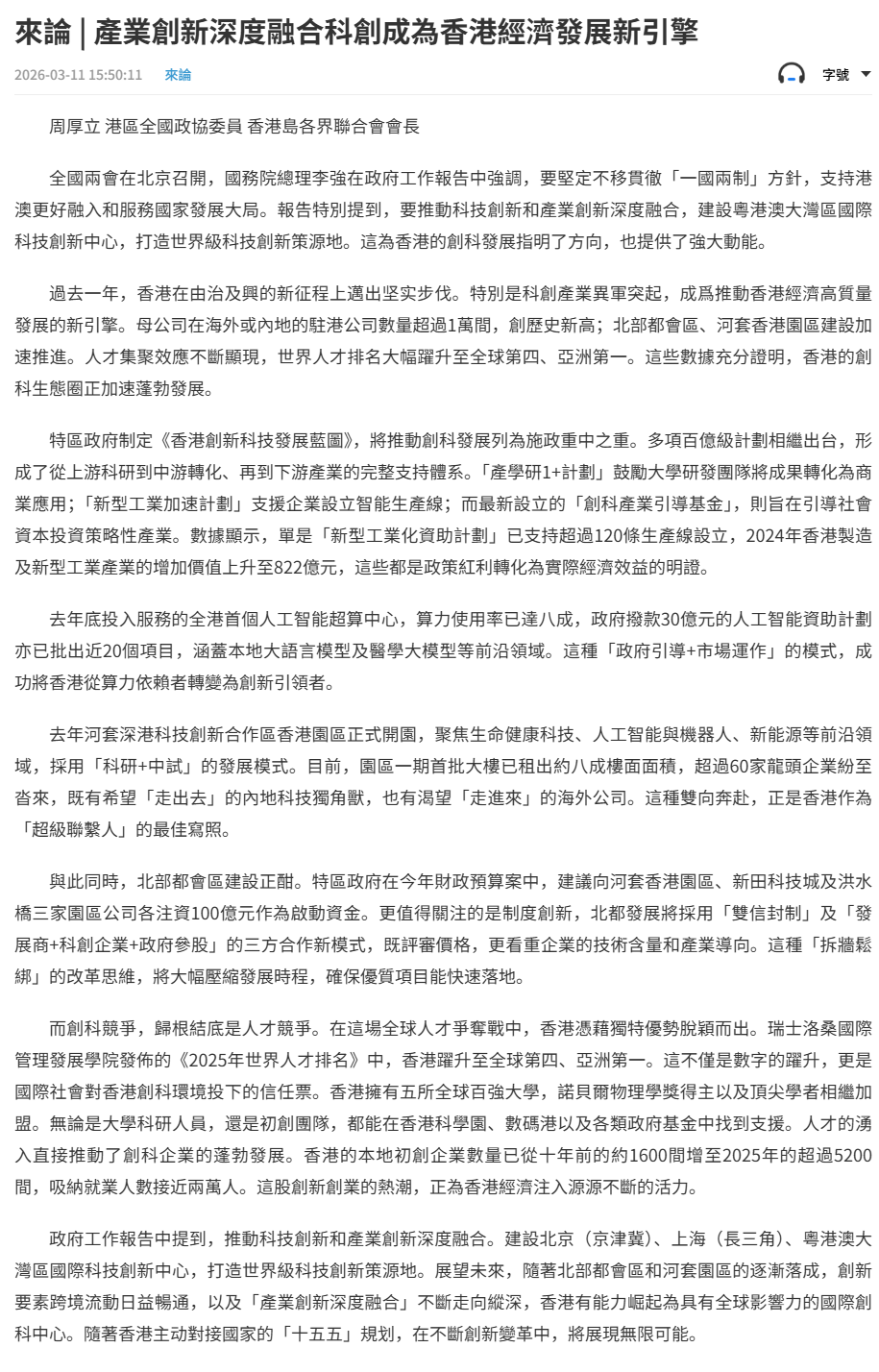 全國兩會在北京召開,國務院總理李強在政府工作報告中強調,要堅定不移貫徹「一國兩制」方針,支持港澳更好融入和服務國家發展大局。報告特別提到,要推動科技創新和產業創新深度融合,建設粵港澳大灣區國際科技創新中心,打造世界級科技創新策源地。這為香港的創科發展指明了方向,也提供了強大動能。