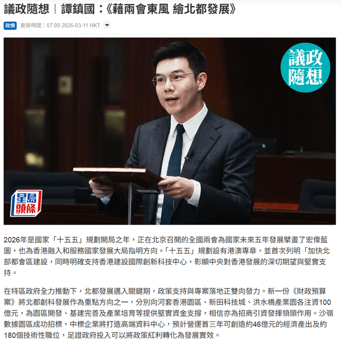 2026年是國家「十五五」規劃開局之年,正在北京召開的全國兩會為國家未來五年發展擘畫了宏偉藍圖,也為香港融入和服務國家發展大局指明方向。「十五五」規劃設有港澳專章,並首次列明「加快北部都會區建設,同時明確支持香港建設國際創新科技中心,彰顯中央對香港發展的深切期望與堅實支持。