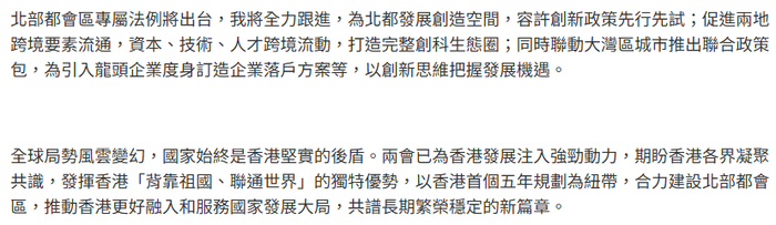 全球局勢風雲變幻,國家始終是香港堅實的後盾。兩會已為香港發展注入強勁動力,期盼香港各界凝聚共識,發揮香港「背靠祖國、聯通世界」的獨特優勢,以香港首個五年規劃為紐帶,合力建設北部都會區,推動香港更好融入和服務國家發展大局,共譜長期繁榮穩定的新篇章。