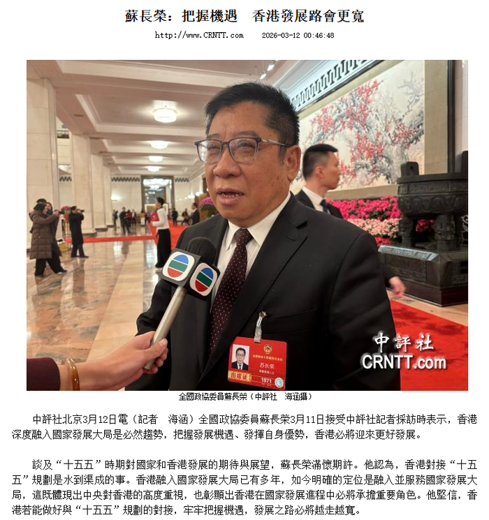 中評社北京3月12日電(記者 海涵)全國政協委員蘇長榮3月11日接受中評社記者採訪時表示,香港深度融入國家發展大局是必然趨勢,把握發展機遇、發揮自身優勢,香港必將迎來更好發展。