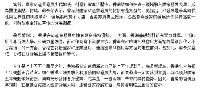 當前,國家AI產業發展步伐加快,引發社會廣泛關注,香港該如何在這一領域融入國家發展大局,成為關注焦點。對此,蘇長榮表示,香港與國家AI產業發展的對接會是無縫的。他指出,AI發展是兼具時代性與世界性的科技革命,發展浪潮勢不可擋,香港亦將勇立潮頭,必然會與國家的發展步伐保持高度一致,同時緊跟全球AI革命的發展潮流。
