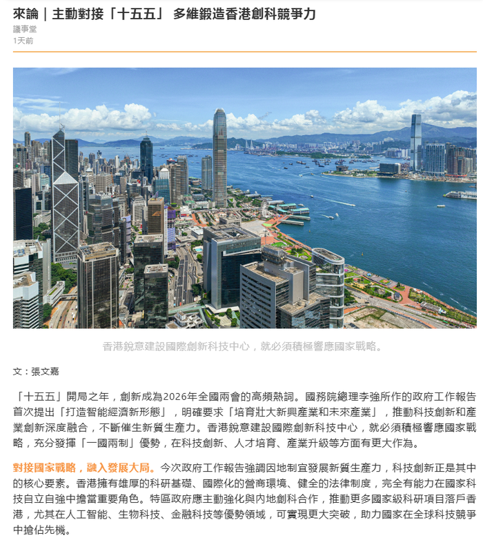 「十五五」開局之年,創新成為2026年全國兩會的高頻熱詞。國務院總理李強所作的政府工作報告首次提出「打造智能經濟新形態」,明確要求「培育壯大新興產業和未來產業」,推動科技創新和產業創新深度融合,不斷催生新質生產力。香港銳意建設國際創新科技中心,就必須積極響應國家戰略,充分發揮「一國兩制」優勢,在科技創新、人才培育、產業升級等方面有更大作為。