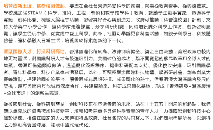 從校園到社會、從科研到產業,創新科技正在塑造香港的未來。站在「十五五」開局的新起點,我們應以更開放的姿態擁抱科技變革,培養和吸納更多具備科學素養的青年人才,力促國際創新科技中心建設提速。相信在國家的大力支持和特區政府、社會各界的共同努力下,我們定能盡展所長,以創科之力驅動高質量發展、賦能中國式現代化。