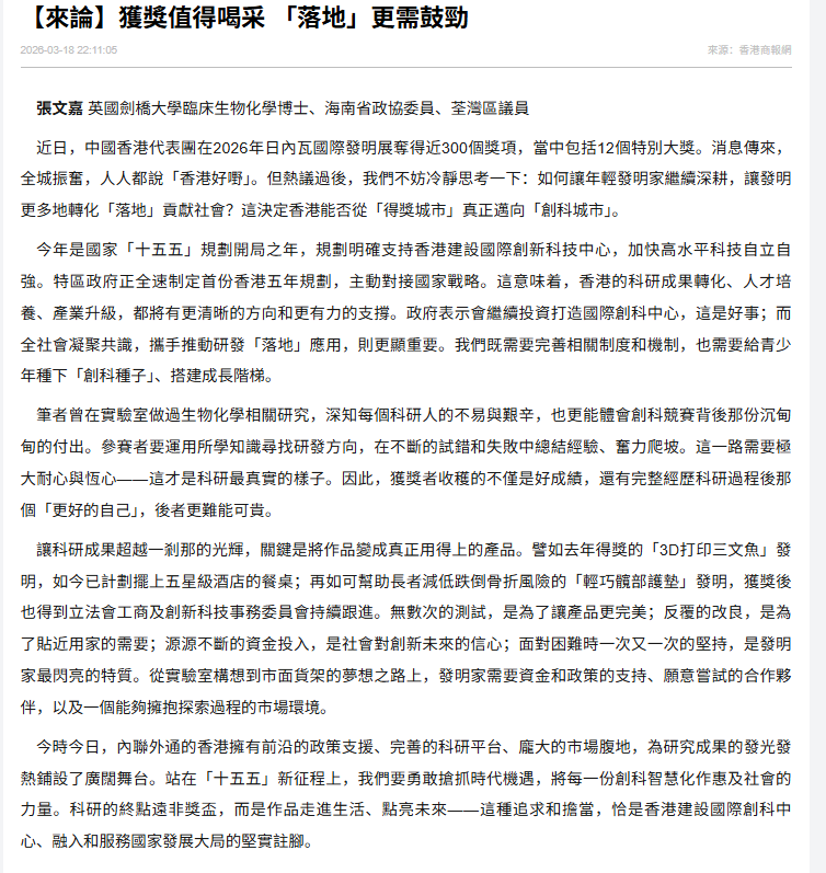 今年是國家「十五五」規劃開局之年,規劃明確支持香港建設國際創新科技中心,加快高水平科技自立自強。特區政府正全速制定首份香港五年規劃,主動對接國家戰略。這意味着,香港的科研成果轉化、人才培養、產業升級,都將有更清晰的方向和更有力的支撐。政府表示會繼續投資打造國際創科中心,這是好事;而全社會凝聚共識,攜手推動研發「落地」應用,則更顯重要。我們既需要完善相關制度和機制,也需要給青少年種下「創科種子」、搭建成長階梯。