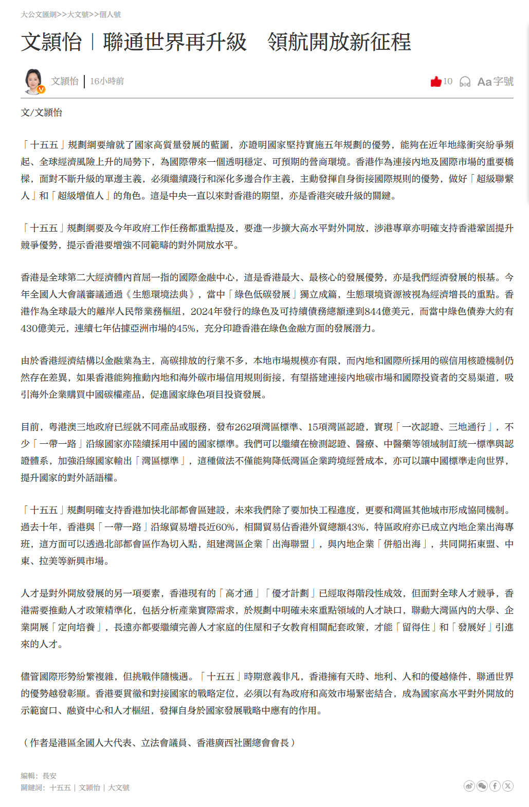 「十五五」規劃綱要及今年政府工作任務都重點提及,要進一步擴大高水平對外開放,涉港專章亦明確支持香港鞏固提升競爭優勢,提示香港要增強不同範疇的對外開放水平。