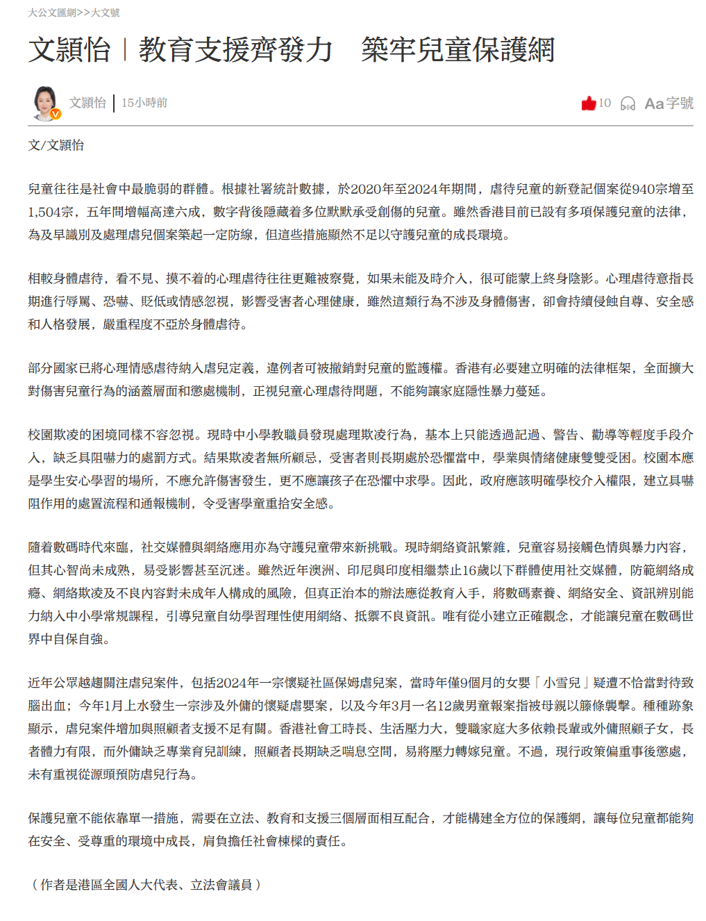 兒童往往是社會中最脆弱的群體。根據社署統計數據,於2020年至2024年期間,虐待兒童的新登記個案從940宗增至1,504宗,五年間增幅高達六成,數字背後隱藏着多位默默承受創傷的兒童。雖然香港目前已設有多項保護兒童的法律,為及早識別及處理虐兒個案築起一定防線,但這些措施顯然不足以守護兒童的成長環境。