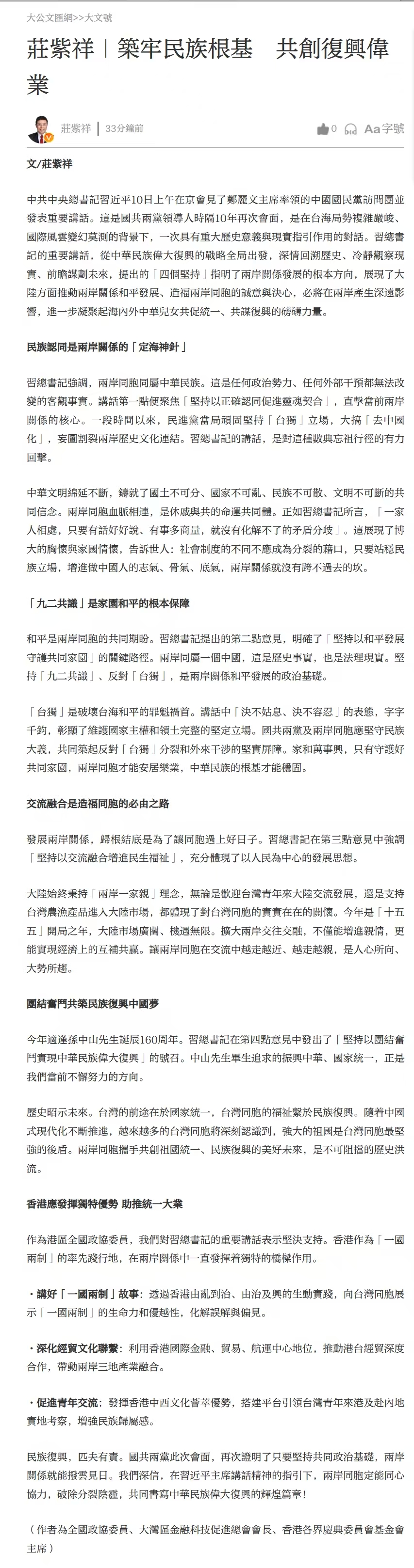 作為港區全國政協委員,我們對習總書記的重要講話表示堅決支持。香港作為「一國兩制」的率先踐行地,在兩岸關係中一直發揮着獨特的橋樑作用。