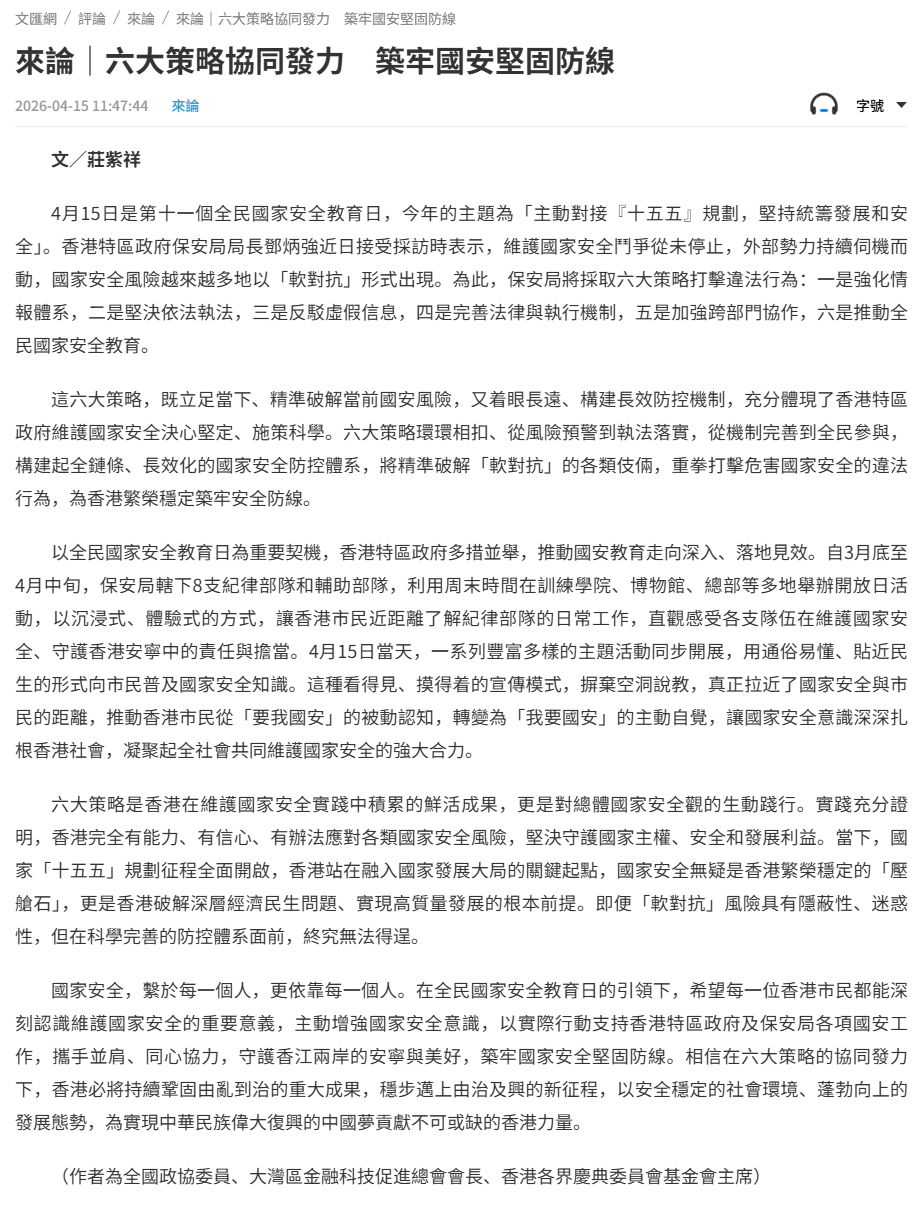 國家安全,繫於每一個人,更依靠每一個人。在全民國家安全教育日的引領下,希望每一位香港市民都能深刻認識維護國家安全的重要意義,主動增強國家安全意識,以實際行動支持香港特區政府及保安局各項國安工作,攜手並肩、同心協力,守護香江兩岸的安寧與美好,築牢國家安全堅固防線。相信在六大策略的協同發力下,香港必將持續鞏固由亂到治的重大成果,穩步邁上由治及興的新征程,以安全穩定的社會環境、蓬勃向上的發展態勢,為實現中華民族偉大復興的中國夢貢獻不可或缺的香港力量。