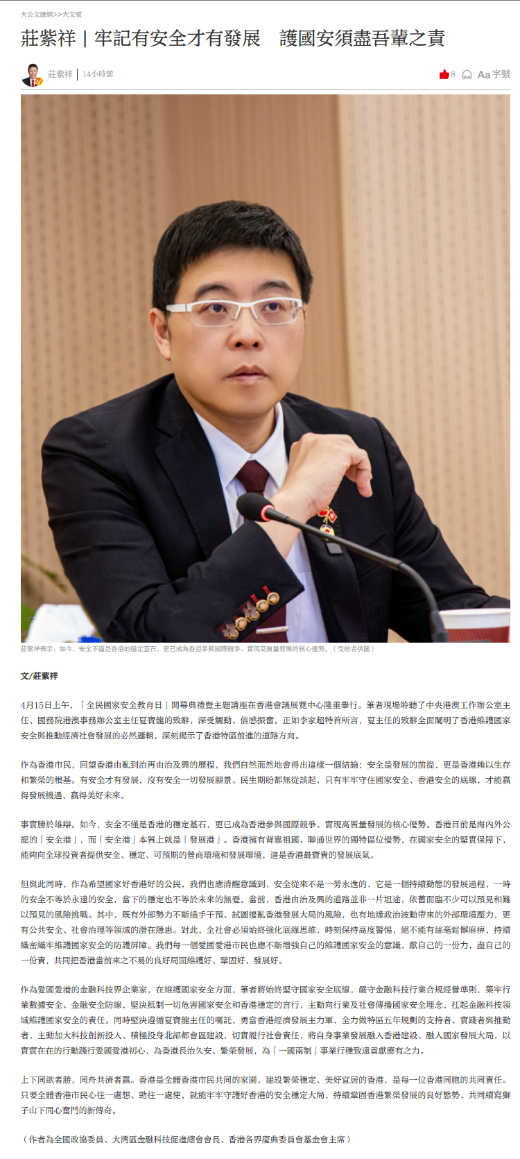 4月15日上午,「全民國家安全教育日」開幕典禮暨主題講座在香港會議展覽中心隆重舉行。筆者現場聆聽了中央港澳工作辦公室主任、國務院港澳事務辦公室主任夏寶龍的致辭,深受觸動、倍感振奮。正如李家超特首所言,夏主任的致辭全面闡明了香港維護國家安全與推動經濟社會發展的必然邏輯,深刻揭示了香港特區前進的道路方向。
