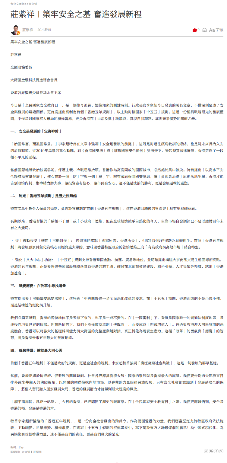 今日是「全民國家安全教育日」,是一個撫今追昔、鑑往知來的關鍵時刻。行政長官李家超今日發表的署名文章,不僅深刻闡述了安全與發展的辯證關係,更首度提出將制定首個「香港五年規劃」,以主動對接國家「十五五」規劃。這是一份極具戰略眼光的發展藍圖,不僅是對國家宏大布局的積極響應,更是香港在「由治及興」新階段,實現自我超越、鞏固競爭優勢的關鍵之舉。