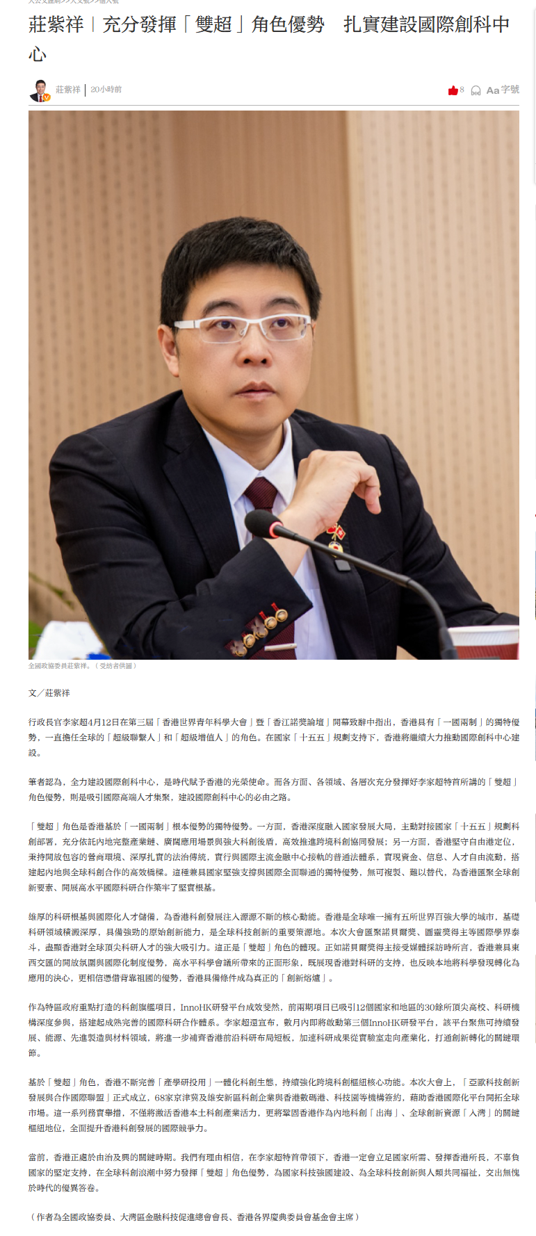 筆者認為,全力建設國際創科中心,是時代賦予香港的光榮使命。而各方面、各領域、各層次充分發揮好李家超特首所講的「雙超」角色優勢,則是吸引國際高端人才集聚,建設國際創科中心的必由之路。