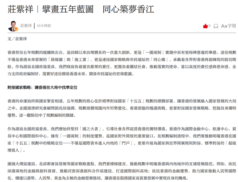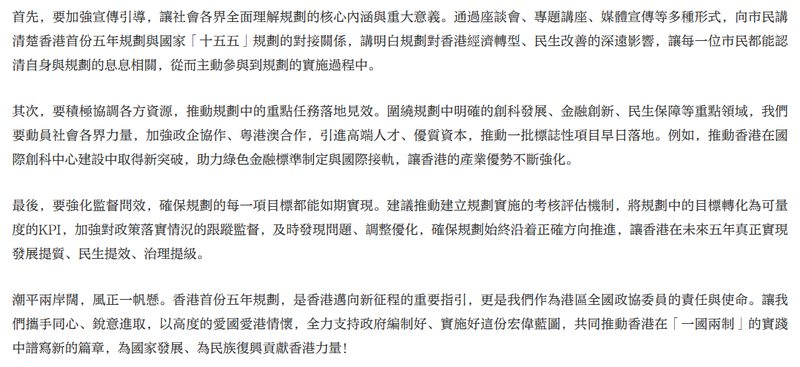潮平兩岸闊,風正一帆懸。香港首份五年規劃,是香港邁向新征程的重要指引,更是我們作為港區全國政協委員的責任與使命。讓我們攜手同心、銳意進取,以高度的愛國愛港情懷,全力支持政府編制好、實施好這份宏偉藍圖,共同推動香港在「一國兩制」的實踐中譜寫新的篇章,為國家發展、為民族復興貢獻香港力量!