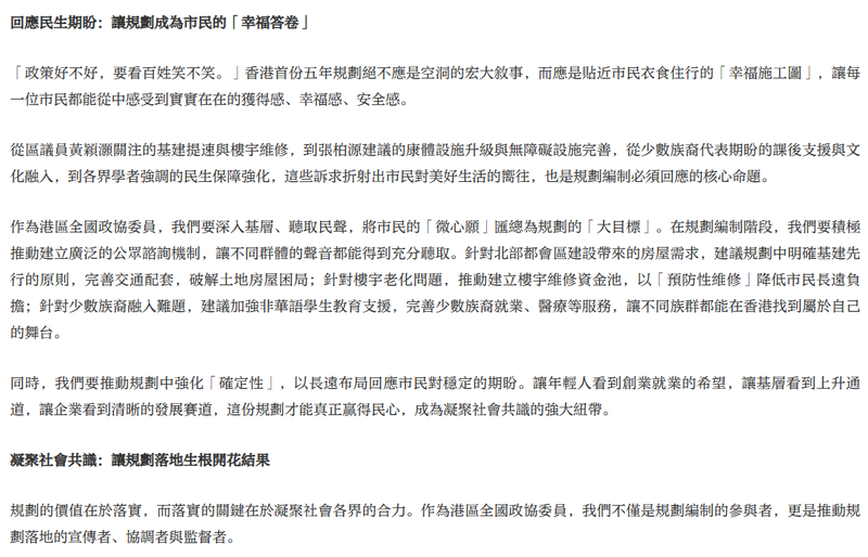 香港首份五年規劃的醞釀與出台,是回歸以來治理體系的一次重大創新,更是「一國兩制」實踐中具有里程碑意義的舉措。這份規劃不僅是香港未來發展的「路線圖」與「施工書」,更是連接國家戰略與市民福祉的「同心橋」,承載着各界對香港再創輝煌的殷切期盼。作為港區全國政協委員,我們既肩負着建言獻策的責任,更擔負着團結社會、推動落實的使命,當以高度的責任感與使命感,全力支持政府編制好、落實好這份關係香港未來、關係市民福祉的宏偉藍圖。
