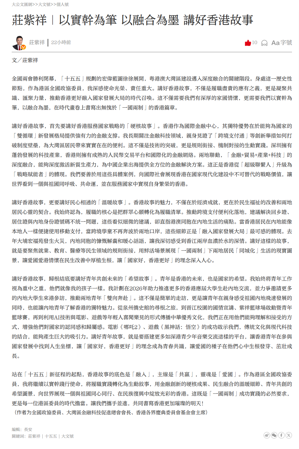 站在「十五五」新征程的起點,香港故事的底色是「融入」,主線是「共贏」,靈魂是「愛國」。作為港區全國政協委員,我將繼續以實幹踐行使命,將履職實踐轉化為生動敘事,用金融創新的硬核成果、民生融合的溫暖細節、青年共創的希望圖景,向世界展現一個與祖國同心同行、在民族復興中綻放光彩的香港。這既是「一國兩制」成功實踐的必然要求,更是每一位港區委員的時代擔當。讓我們攜手並進,共同書寫香港更加璀璨的明天!